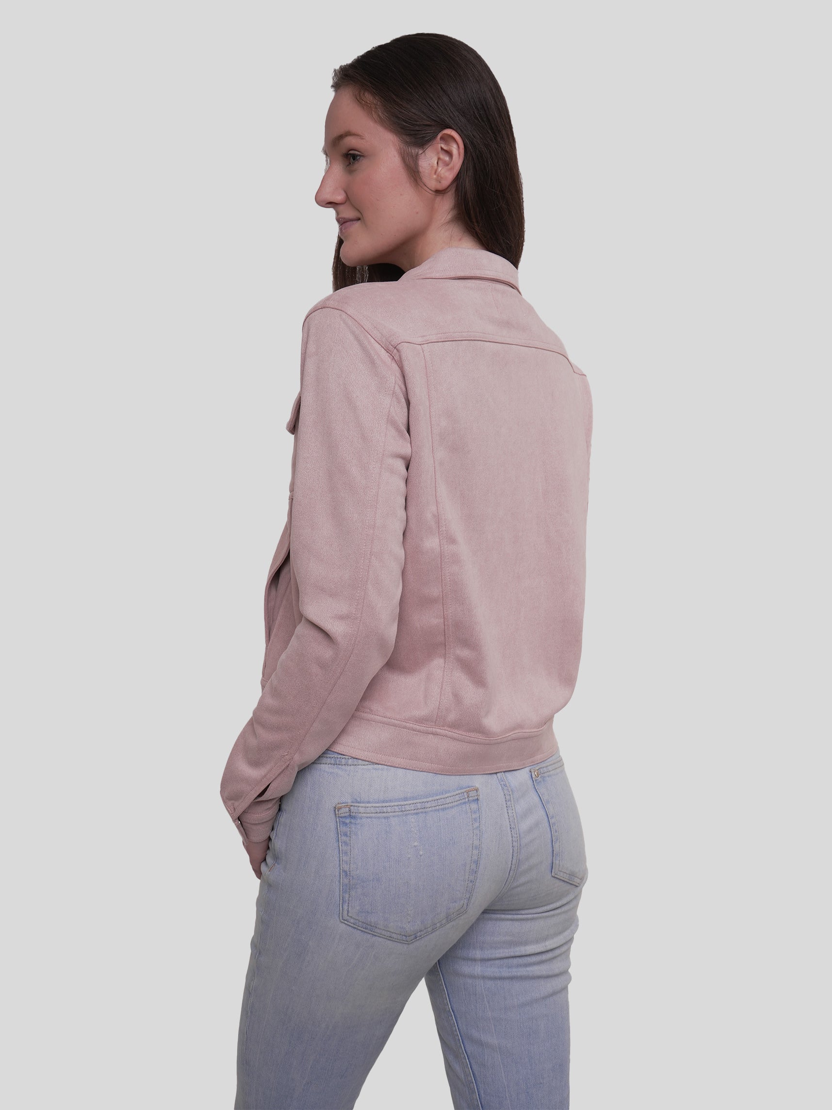 - The Suede jacket features two welt pockets and two buttons secured patch pockets to the chest. Gun metallic tone