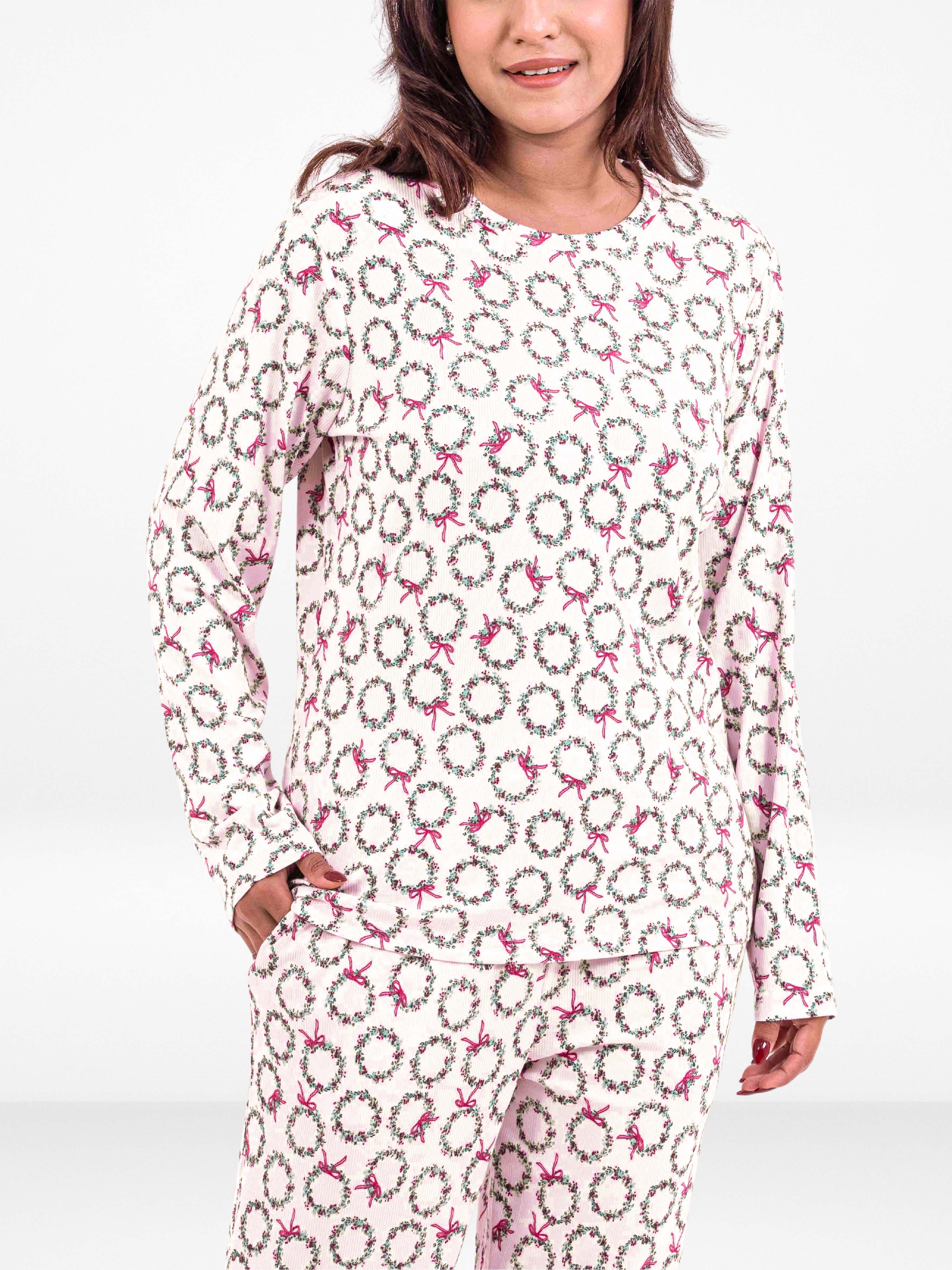Women’s Crew Neck Collar Sleepwear Set – Long- Sleeve All Over Print Pajama Top & Shorts | Soft, Lightweight & Comfortable Nightwear