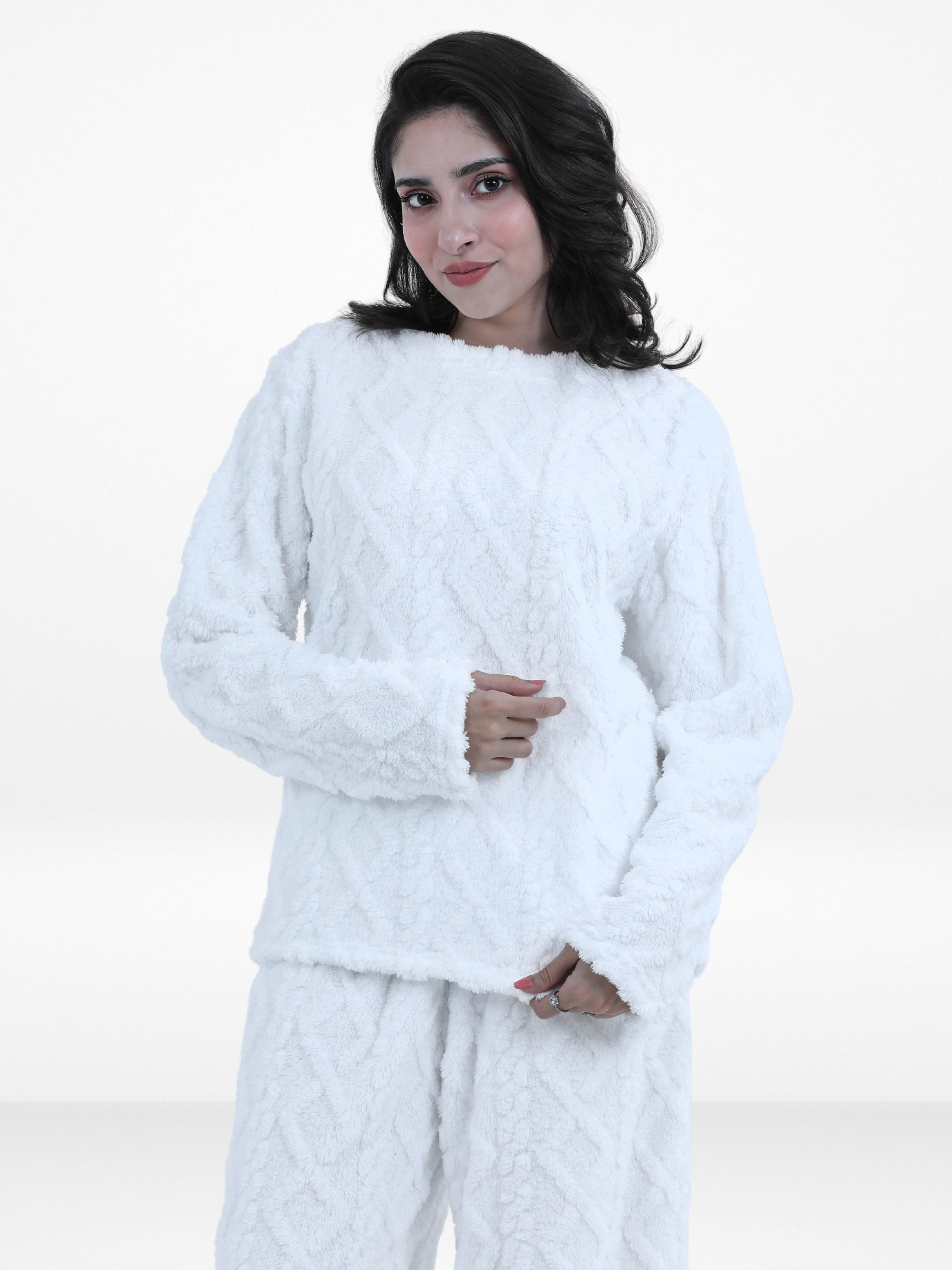 The top features a classic crew neckline and full-length sleeves, designed for maximum coverage and cozy comfort. Subtle textural detailing adds a charming winter aesthetic, giving this set a timeless appeal that’s both elegant and cute. The matching bottoms come with a flexible elastic waistband, offering a perfect fit while allowing ease of movement -ideal for lounging, relaxing, or sleeping.