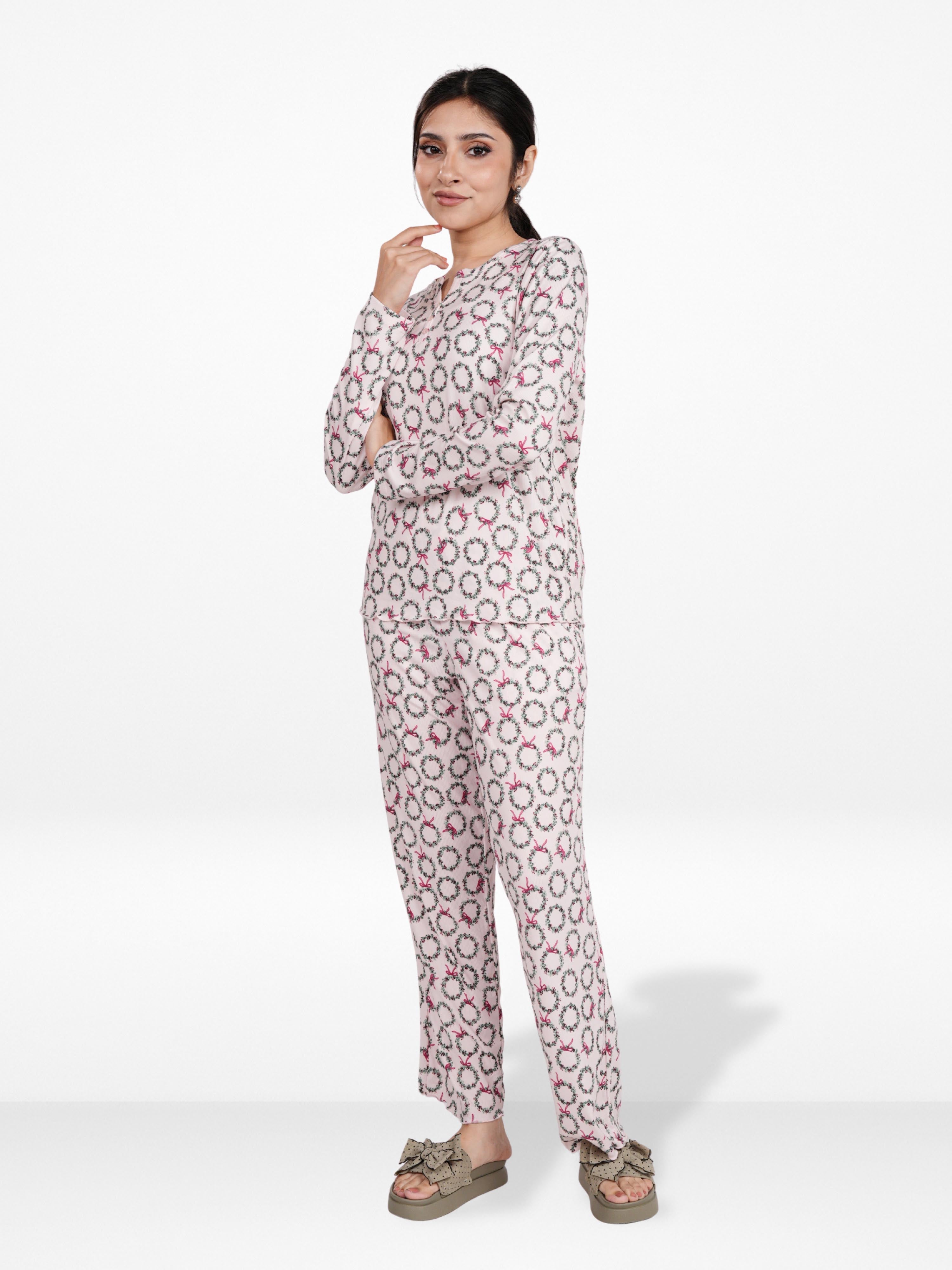 Featuring a playful all-over print, this chic pajama set brings a touch of excitement and personality to your nightly routine.