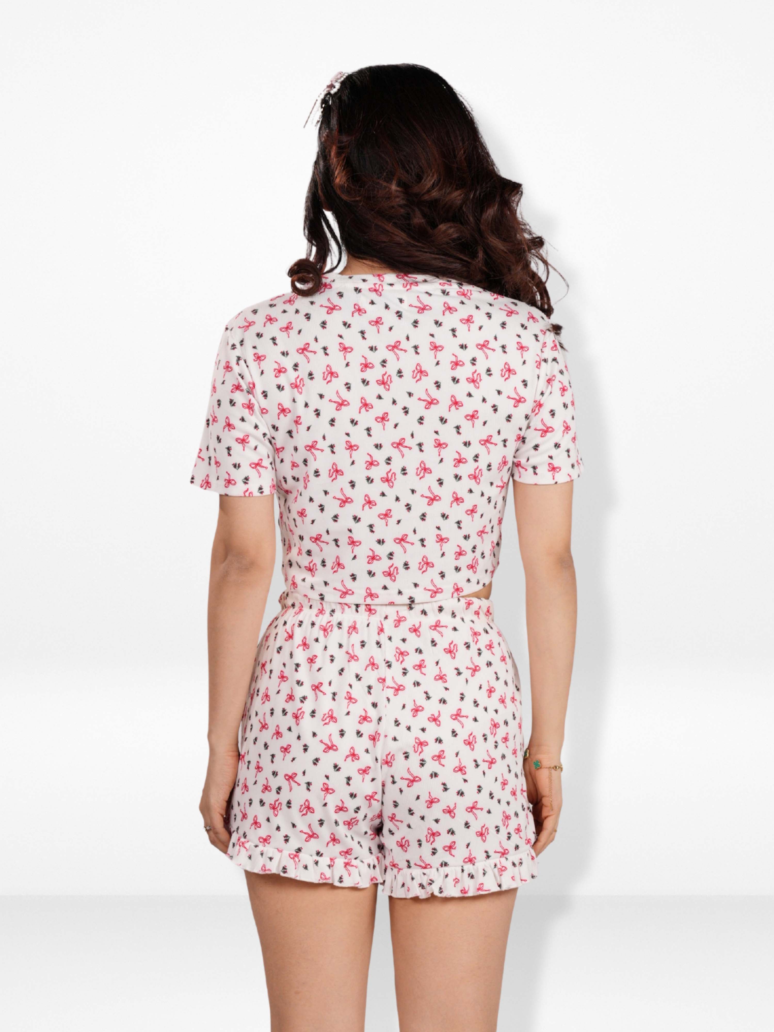 Featuring a playful all-over print, this chic pajama set brings a touch of excitement and personality to your nightly routine.