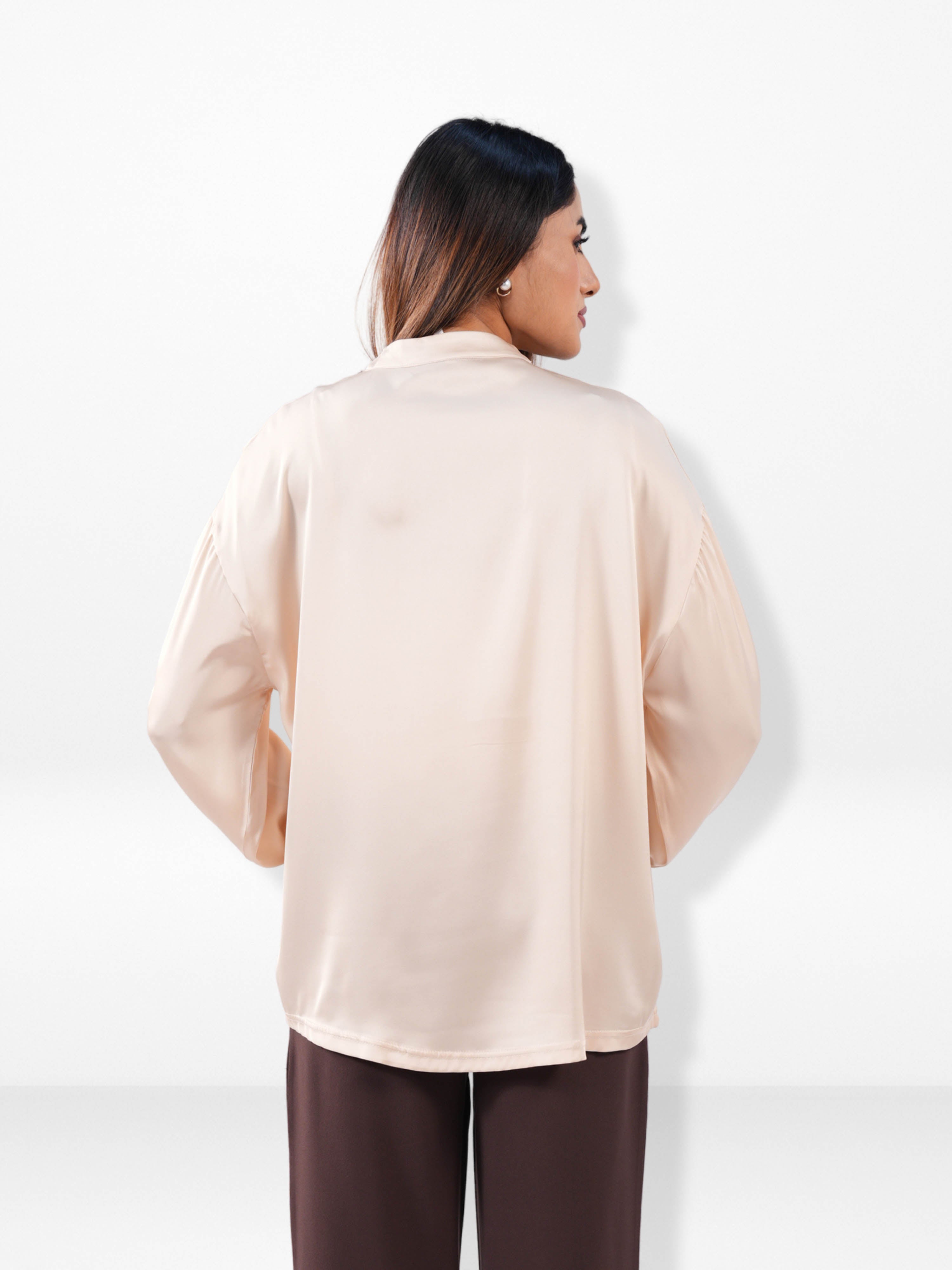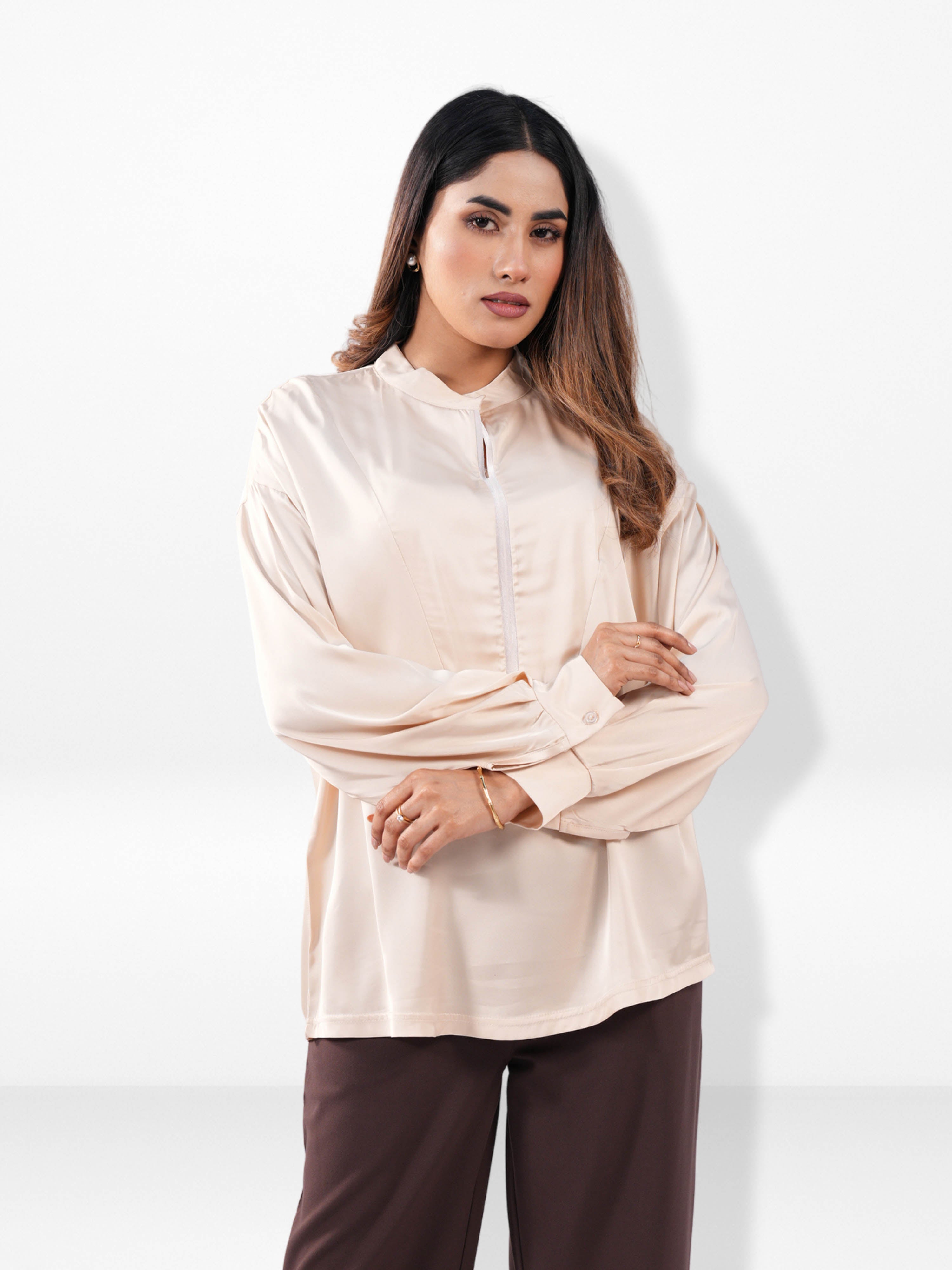 Crafted from a premium blend of 96% Polyester and 4% Spandex (Satin), the fabric feels silky against the skin and provides a slight stretch for a flattering, comfortable fit. The elegant Band Collar enhances its feminine appeal, while the long sleeves with subtle gathered cuffs add graceful volume and sophistication.