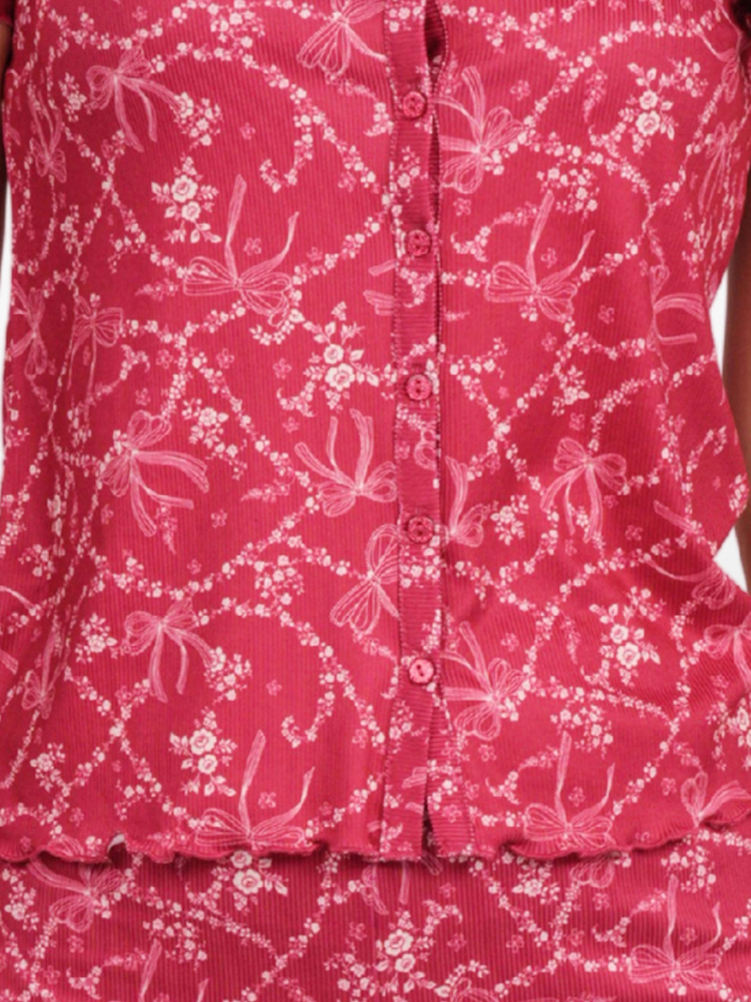 Featuring a playful all-over print, this chic pajama set brings a touch of excitement and personality to your nightly routine.